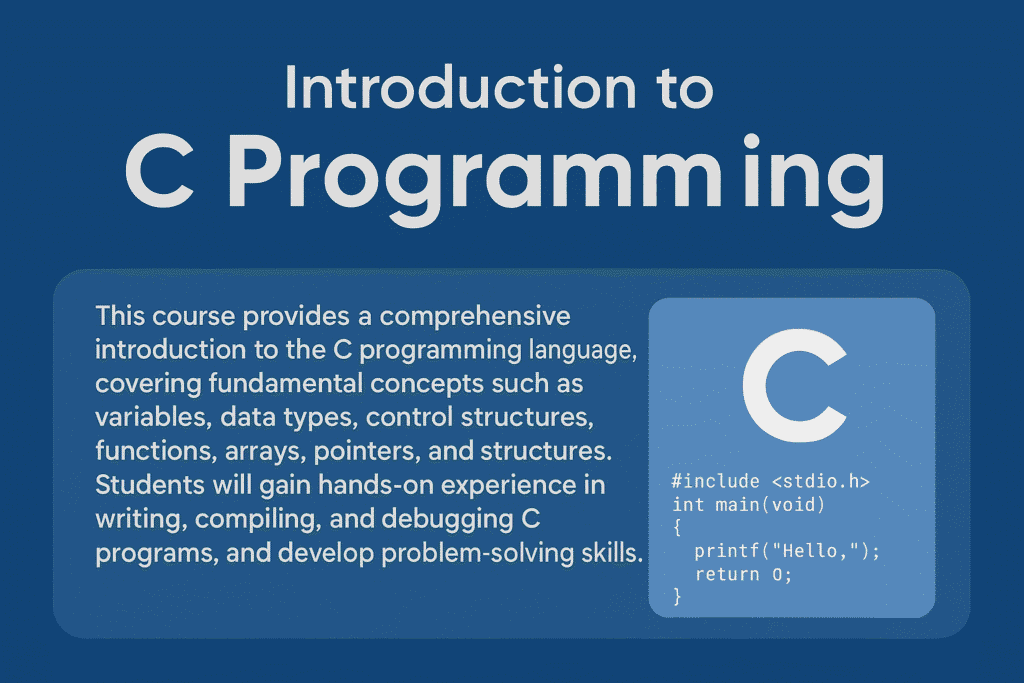 This course provides a comprehensive introduction to the C programming language, which forms the foundation of many modern programming languages and operating systems. Designed for beginners, the course covers the fundamental concepts of programming including variables, data types, control structures, functions, arrays, pointers, and structures. Students will gain hands-on experience writing, compiling, and debugging C programs, while developing problem-solving skills and algorithmic thinking.