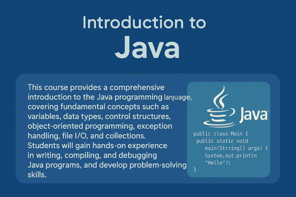 This course introduces students to Java, a versatile, object-oriented programming language widely used in enterprise applications, mobile development, and web-based systems. Designed for beginners, the course covers the fundamentals of Java syntax, object-oriented programming, and practical application development.