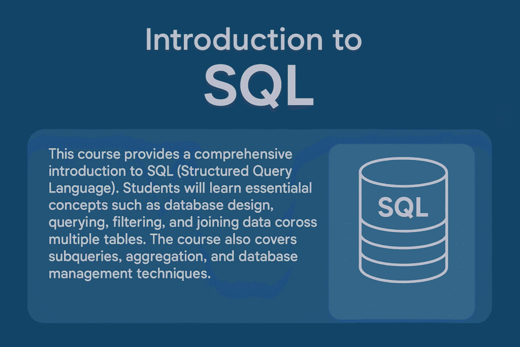 This course provides a comprehensive introduction to SQL (Structured Query Language) — the standard language used to communicate with relational databases. Whether you’re aiming to become a data analyst, software developer, or database administrator, this course builds a strong foundation in database management and data querying.